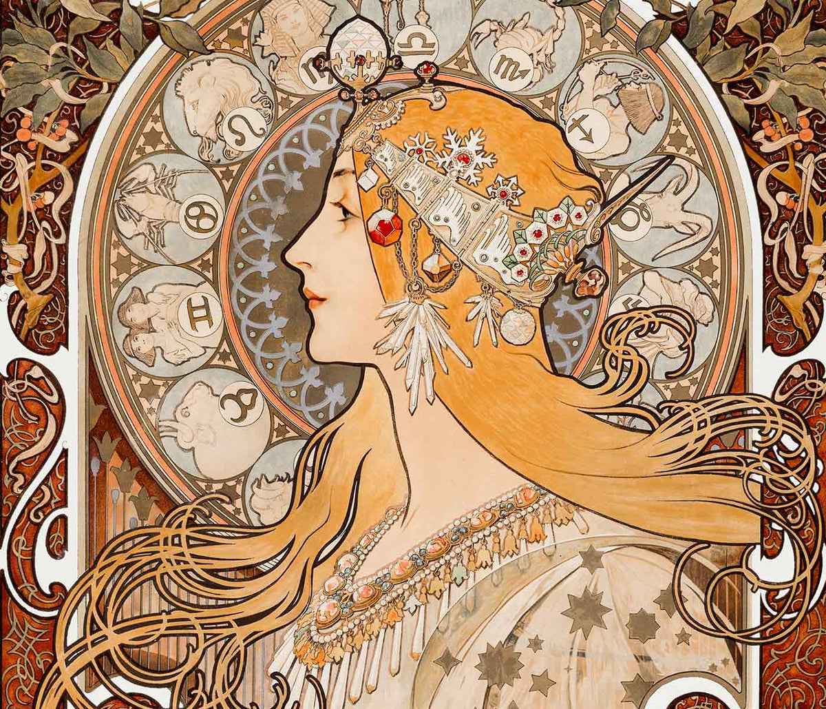 Alphonse Mucha · 1896 · Iconic Art Nouveau advertising poster with a sensual profile and cascading ornamental hair