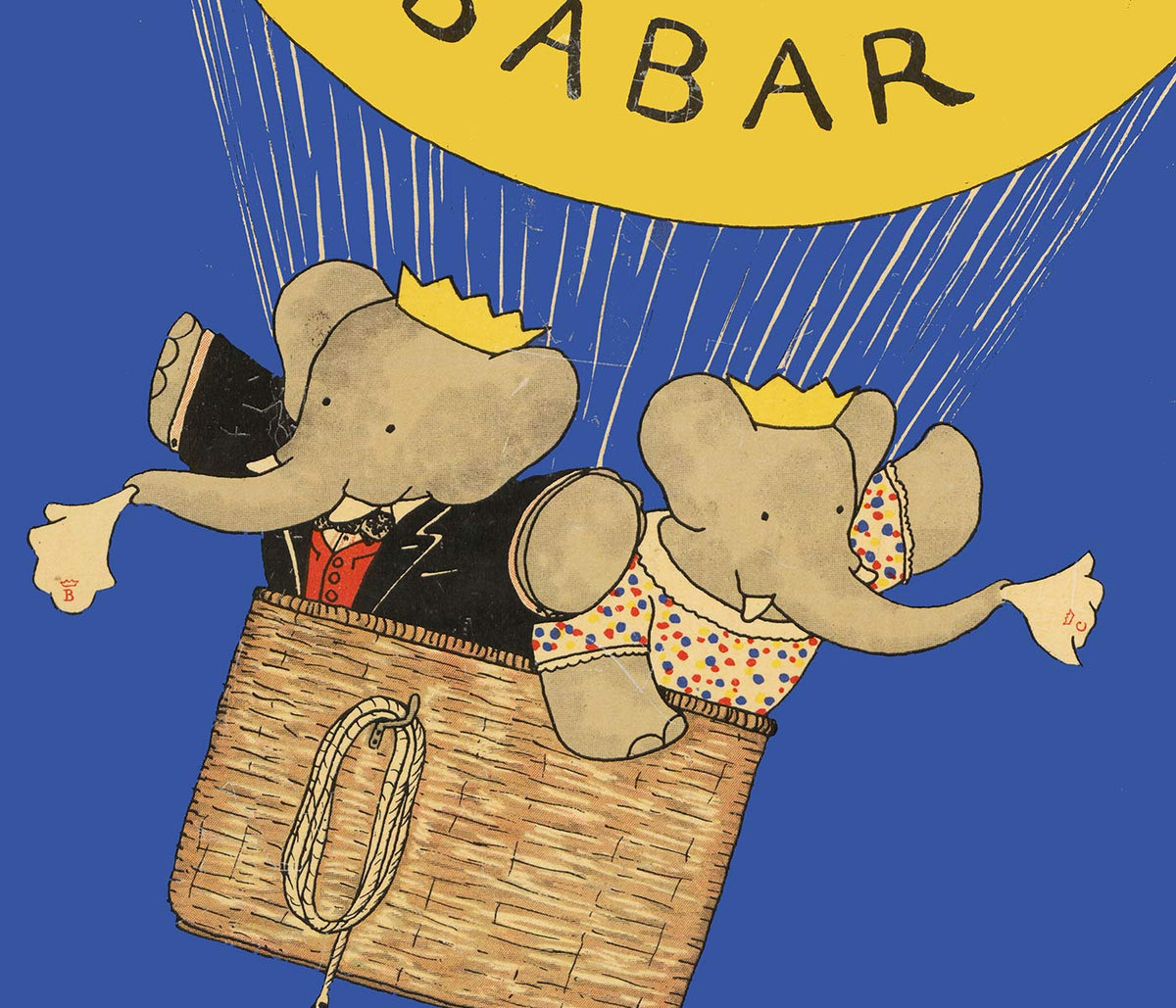 Jean de Brunhoff · 1932 · Whimsical Babar balloon poster with bright yellow lift against a clear blue sky
